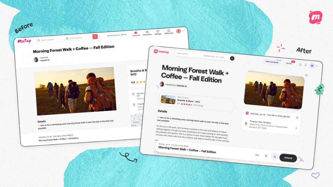 Combining a fresh visual identity with a more intuitive user experience, the new design speaks to our ongoing work to elevate Meetup. We wanted to make the platform a more engaging and inspiring space for fostering human connections, while preserving the core identity and functionality that has anchored the community since Meetup’s earliest days.